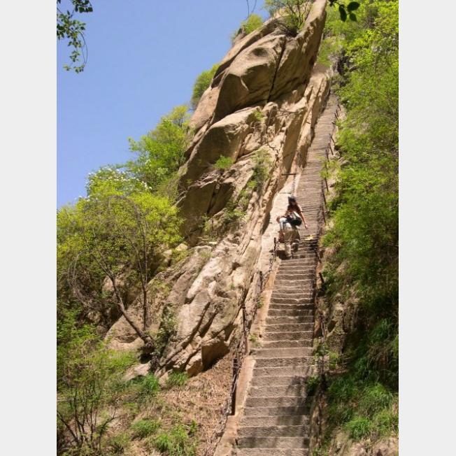 الدرج عالي وضيق ولا يوجد حاجز أو درابزين ليحميكِ من الوقوع عن الجبل، فقط حبل صغير لتتمسكي به