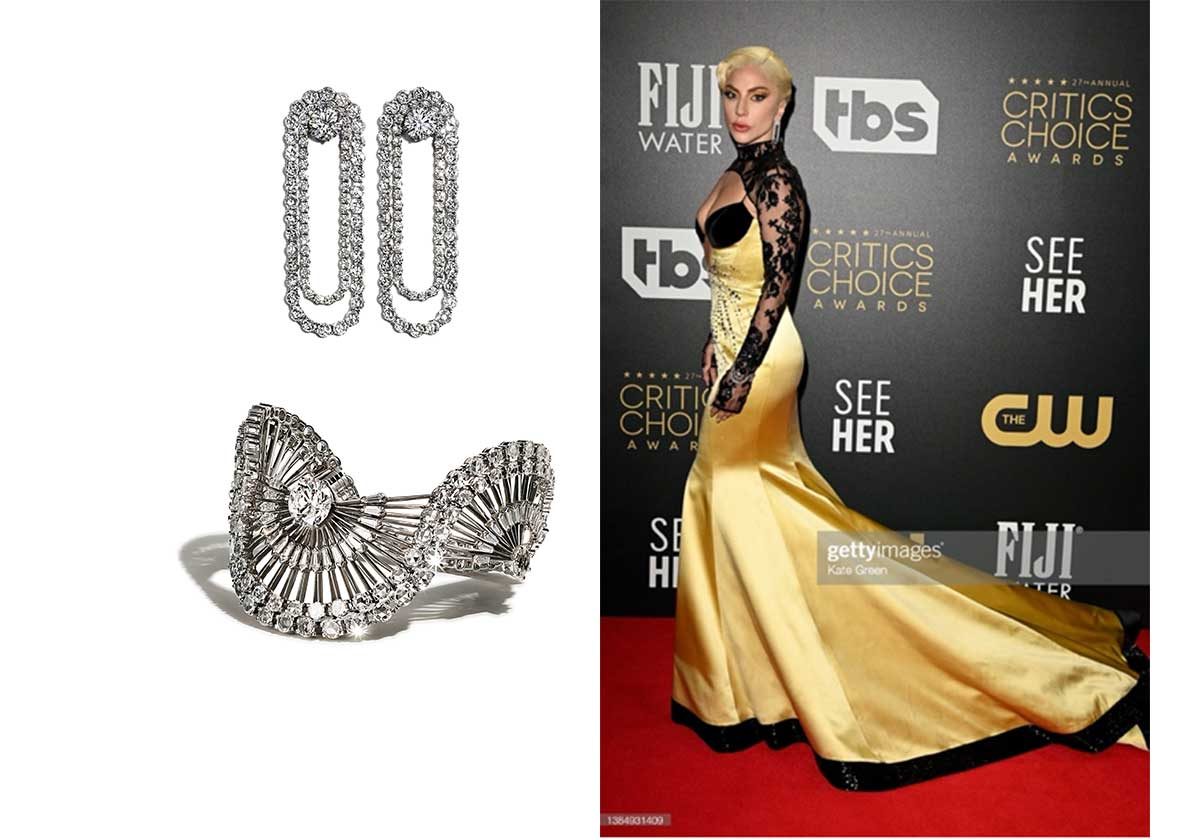 وصلت ليدي غاغا إلى هذا الحفل بفستان من تصميم Gucci تميّز بلونه وقصّته وكذلك قصّته العلوية المكشوفة عن الصدر، والمرفقة بياقة وأكمام طويلة من الدانتيل. ليدي غاغا نسّقت هذه الإطلالة مع أقراط وسوار من تصميم Tiffany & Co.